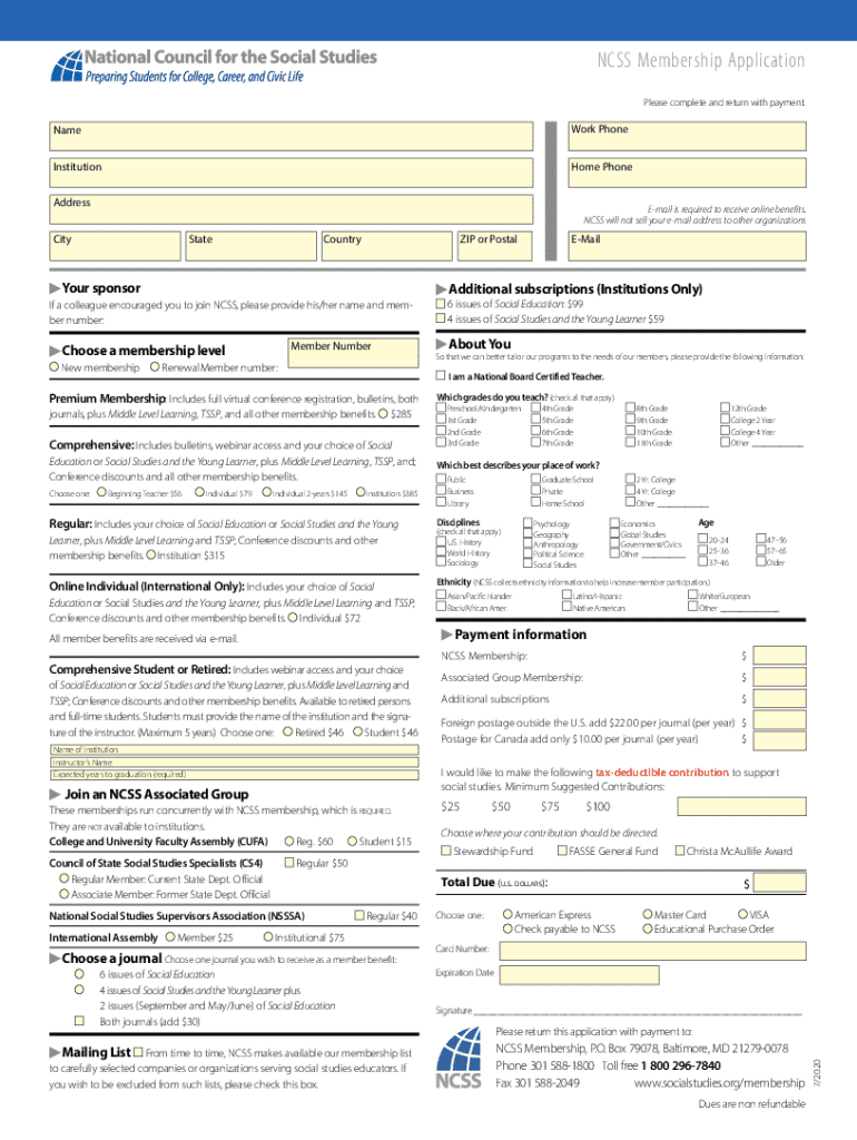 The NCSS membership application typically requires basic personal information, including name, contact details, membership type, and any relevant professional information pertaining to social studies education.