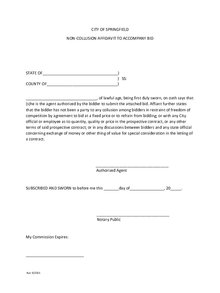 CITY OF SPRINGFIELD CONCLUSION AFFIDAVIT TO ACCOMPANY INSTATE OF___)) SS: COUNTY OF___) ___, of lawful age, being first duly sworn, on oath says that (s)he is the agent authorized by the bidder to