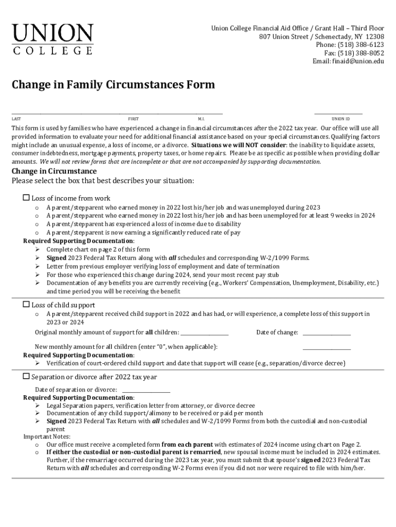 Union College Financial Aid Office / Grant Hall Third Floor 807 Union Street / Schenectady, NY 12308 Phone: (518) 3886123 Fax: (518) 3888052 Email: finaid@union.eduChange in Family Circumstances Form___