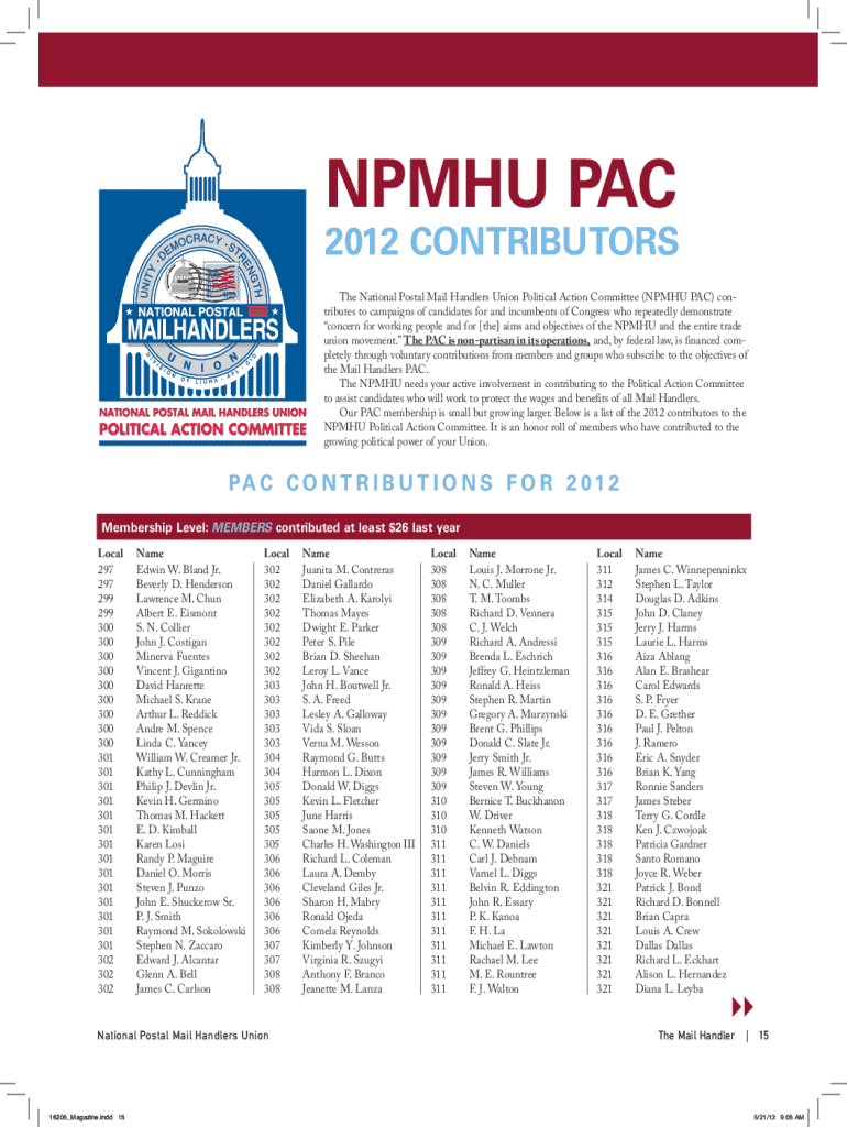 PMH PAC2012 Contributors The National Postal Mail Handlers Union Political Action Committee (PMH PAC) contributes to campaigns of candidates for and incumbents of Congress who repeatedly demonstrate