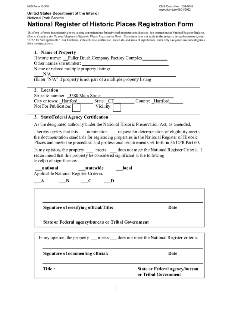 This document serves as the National Register of Historic Places Registration Form for the Fuller Brush Company Factory Complex in Hartford, CT, detailing its significance in industry and architecture.