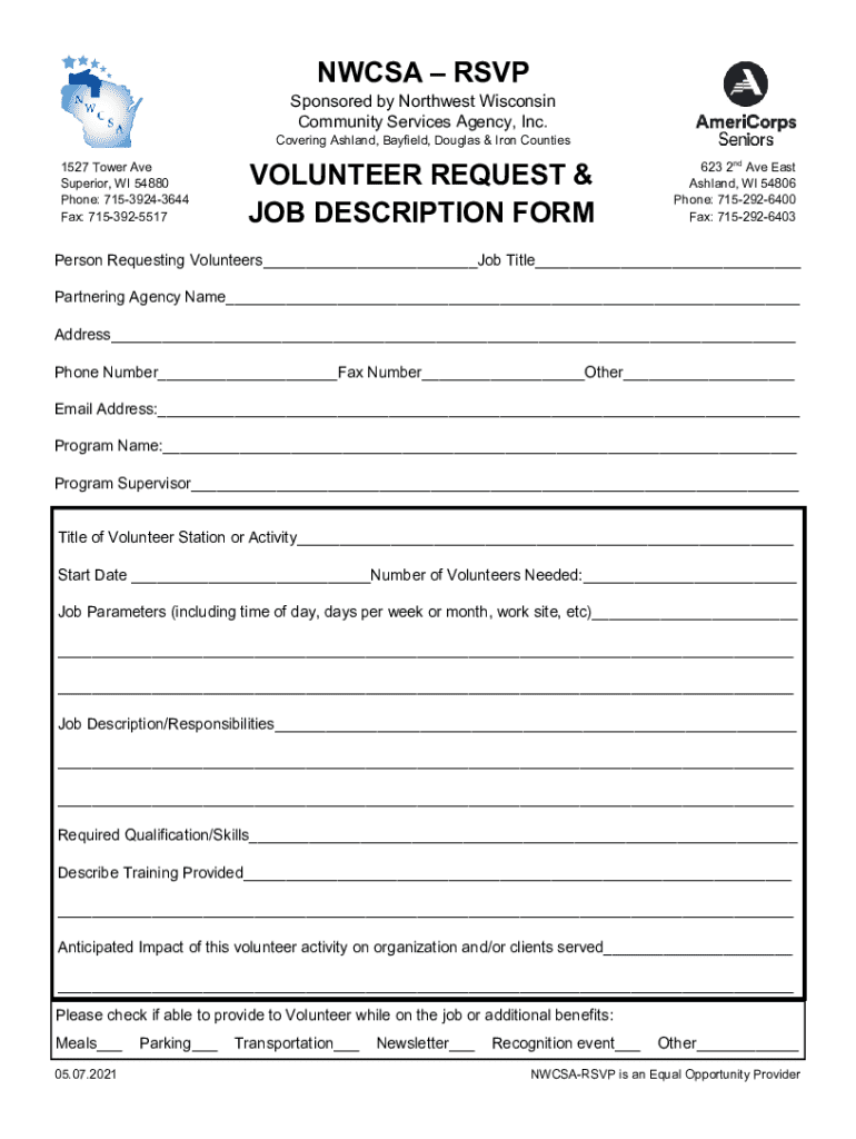 Get the free Nwcsa - Rsvp Volunteer Request and Job Description Form