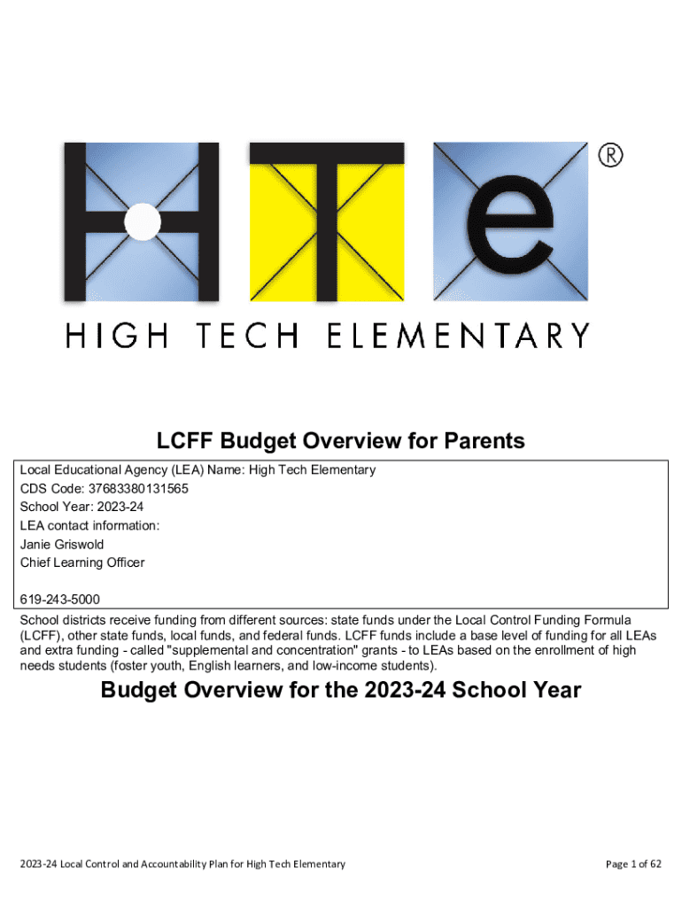 LCFF Budget Overview for Parents Local Educational Agency (LEA) Name: High Tech Elementary CDS Code: 37683380131565 School Year: 202324 LEA contact information: Janie Griswold Chief Learning Officer
