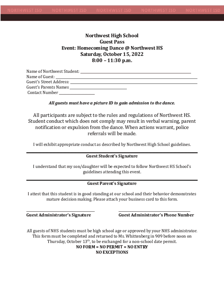 Northwest High School Guest Pass Event: Homecoming Dance @ Northwest HS Saturday, October 15, 2022 8:00 11:30 p.m. Name of Northwest Student: ___ Name of Guest: ___ Guests Street Address: ___ Guests