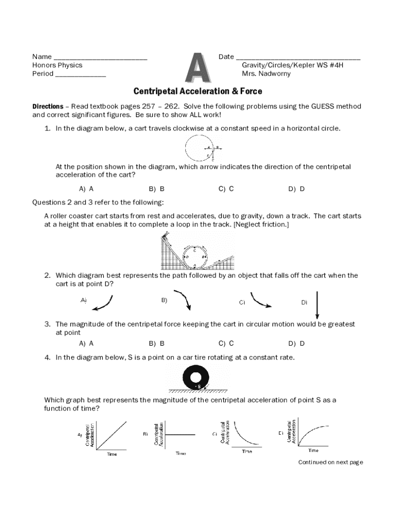 AName ___ Honors Physics Period ___Date ___ Gravity/Circles/Kepler WS #4H Mrs. NadwornyCentripetal Acceleration & Force Directions Read textbook pages 257 262. Solve the following problems using the