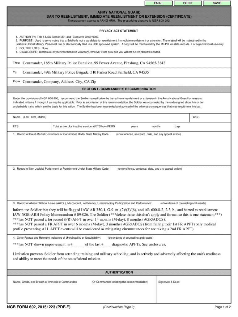 BAR TO REENLISTMENT, IMMEDIATE REENLISTMENT OR EXTENSION (CERTIFICATE)