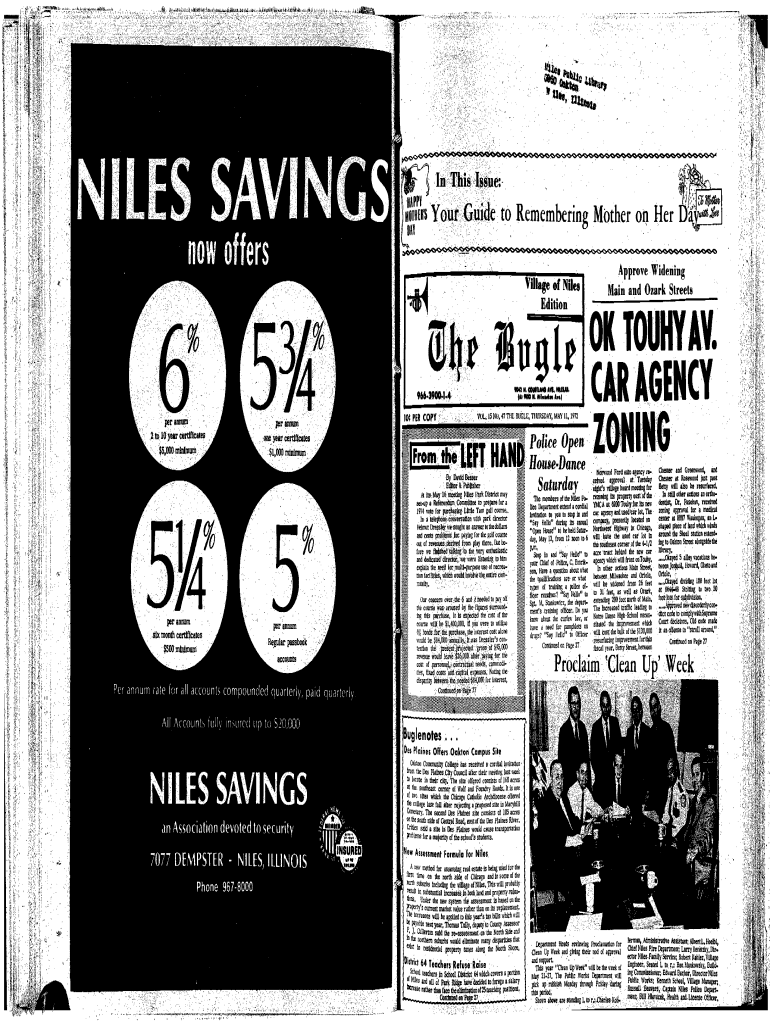 Ifl1his: iSsue:::HAPPY:ourYMOTHEUS;.\'.:ui e to Remembering Mother on Her Dy\'Lnow offersApprove Widening Main and Ozark StreetsVillage of Nues EditionN45 N COIISflND LVI. *IUU.966390014loipernnum one year certificates $1,000minimumla, siso N MIl..b.. A.)VOL. 15 NO. 47 THE BUbLI, ThURSDAY, MAY 11. 1972PER COPY t...*\'.:the.IFroPolice Open ND HouseDance fa.ti,rdnv rn J The members of the Nues PoBy David Denser Editor