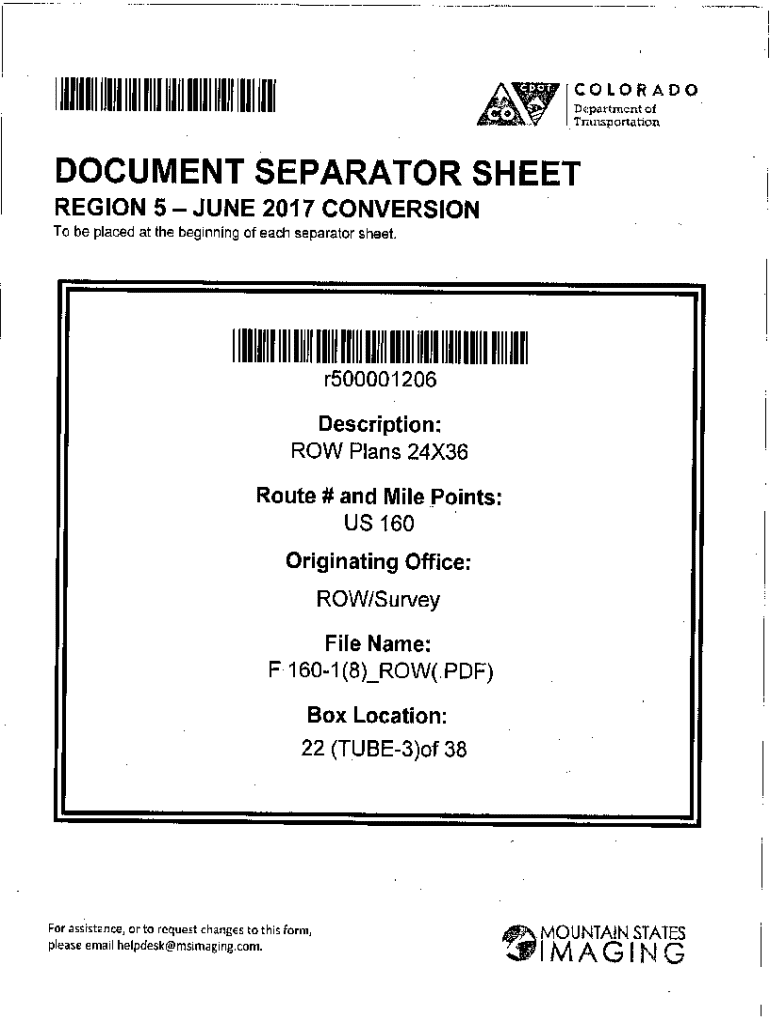 COLORADO Department of TransportationDOCUMENT SEPARATOR SHEET REGION 5 JUNE 2017 CONVERSION To be placed at the beginning of each separator sheet.r500001206Description: ROW Plans 24X36Route # and Mile Points: US 160Originating Office: ROW/Survey File Name:F 1601 (8)_ROW(.PDF) Box Location:22 (TUBE3)of 38For assistance, or to request changes to this form,0 MOUNTAIN STATESplease email helpdesk@msimaging.com.MMAGING00n0/I\'llk0A .m1FmA 10 S1 Ig\"MiMU U I1P