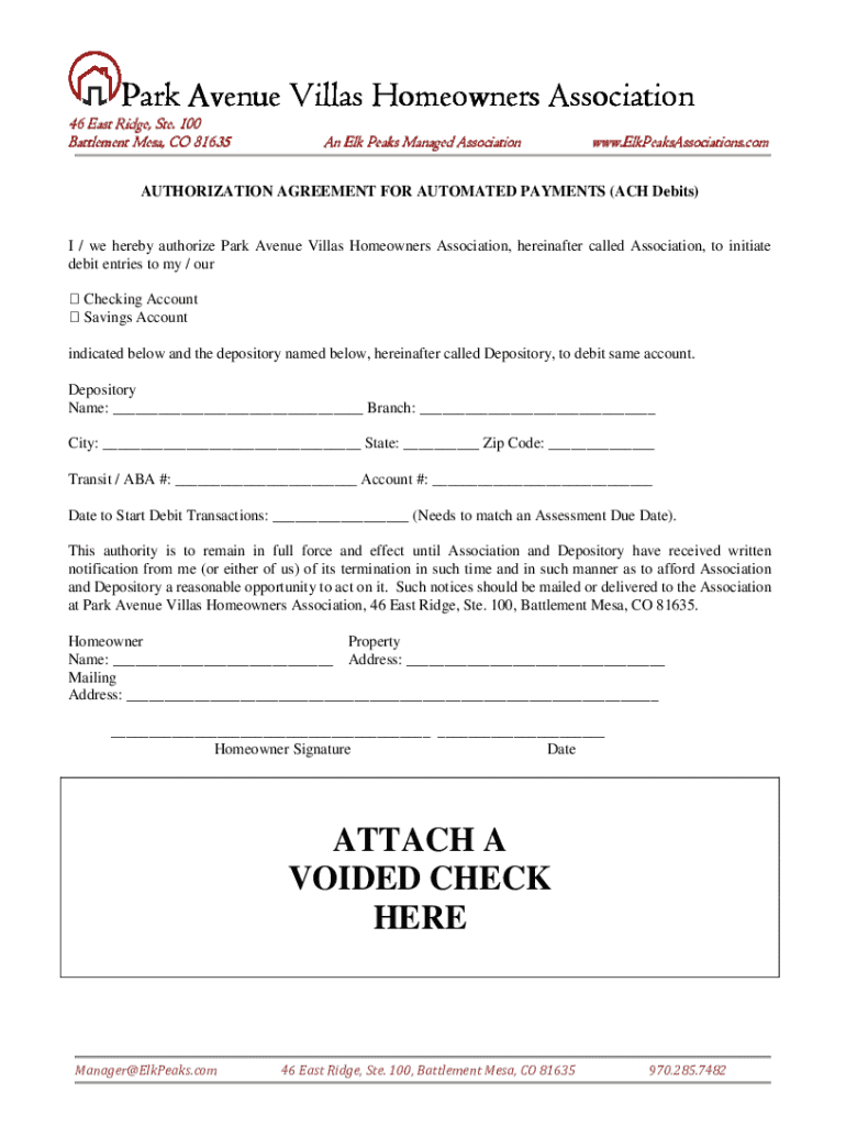 Battlement Mesas, CO 81635An Elk Peaks Managed Association. ElkPeaksAssociations.authorization AGREEMENT FOR AUTOMATED PAYMENTS