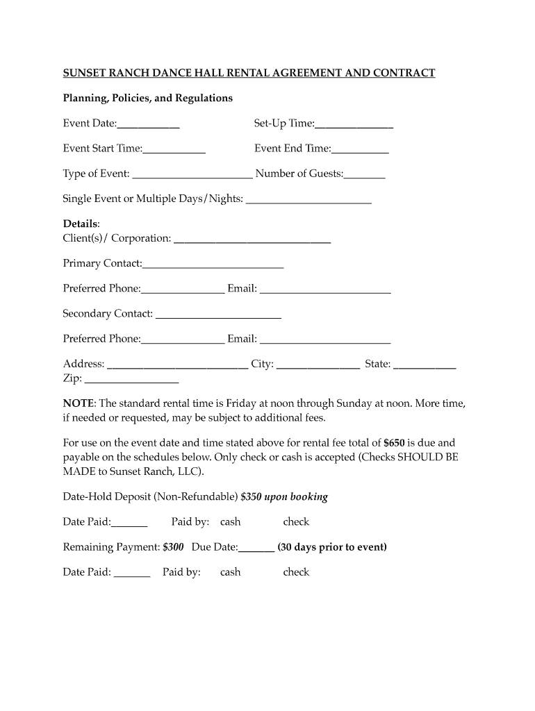 SUNSET RANCH DANCE HALL RENTAL AGREEMENT AND CONTRACT Planning, Policies, and Regulations Event Date: ! ! Event Start Time: ! ! SetUp Time: Event End Time: Type of Event: Number of Guests: Single