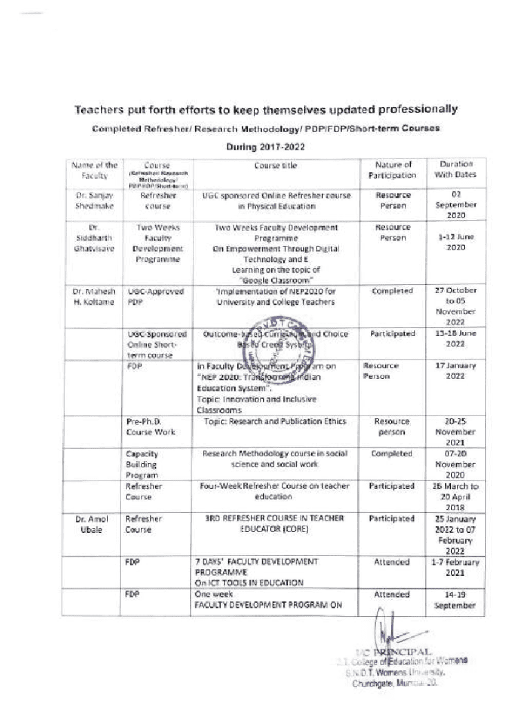 Completed Refresher/ Research Methodology/ PDP/FDP/Short term Courses