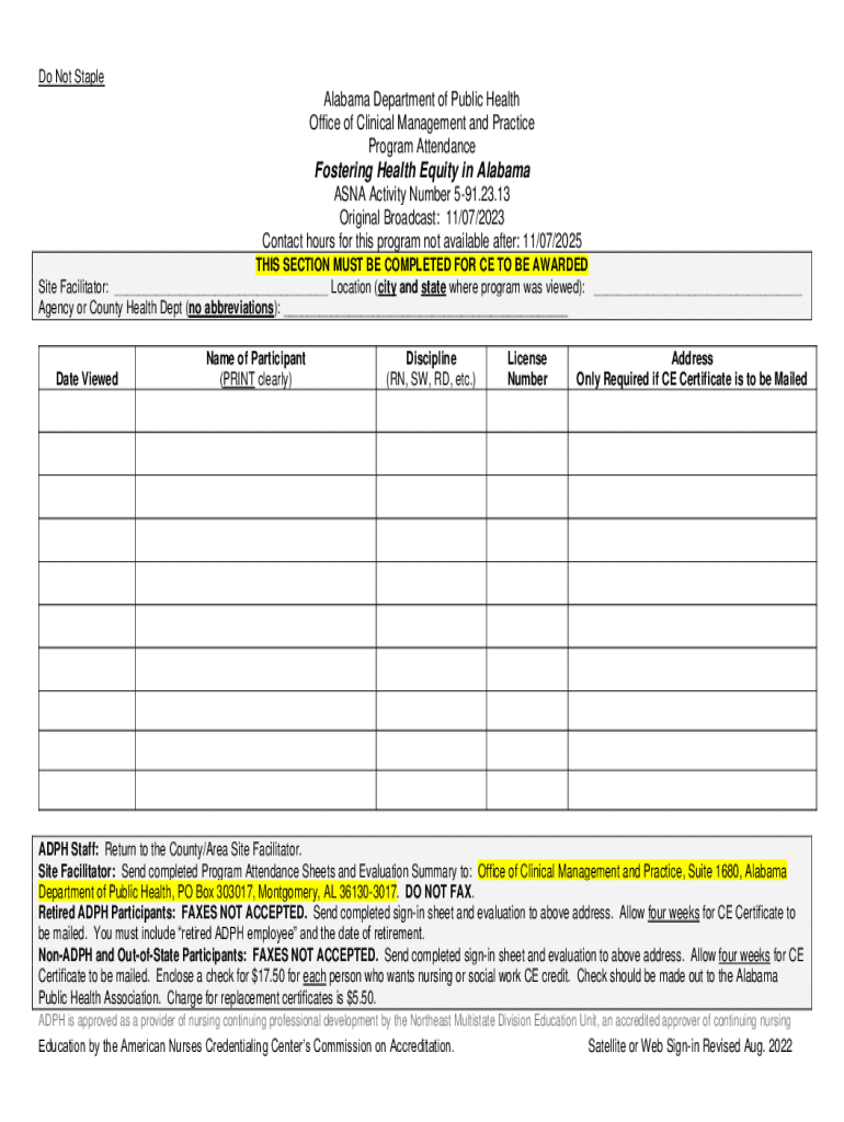 Do Not Staple Alabama Department of Public Health Office of Clinical Management and Practice Program AttendanceFostering Health Equity in Alabama ASIA Activity Number 591.23.13 Original Broadcast:
