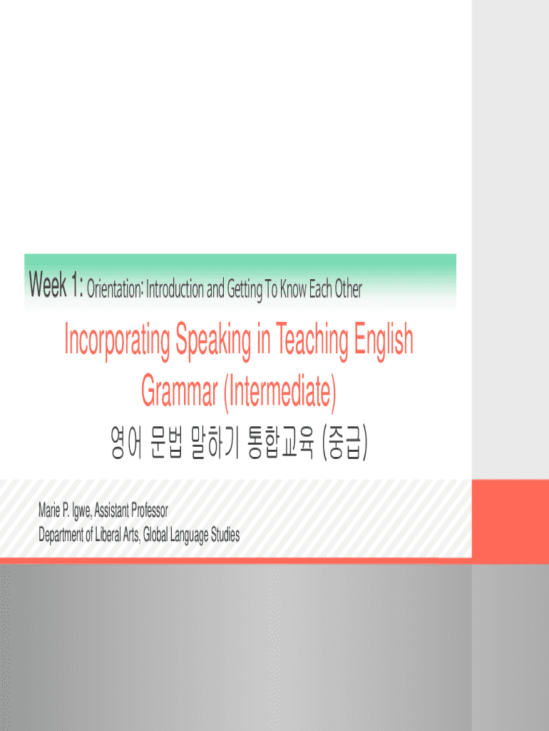 Week 1: Orientation: Introduction and Getting To Know Each OtherIncorporating Speaking in Teaching English Grammar (Intermediate) () Marie P. IGE, Assistant Professor Department of Liberal Arts, Global