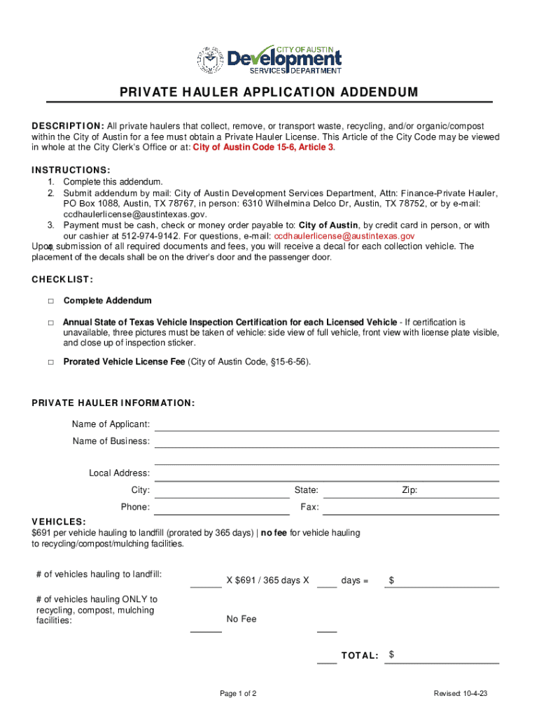 PRIVATE HAULER APPLICATION ADDENDUM DESCRIPTION: All private haulers that collect, remove, or transport waste, recycling, and/or organic/compost within the City of Austin for a fee must obtain a Private