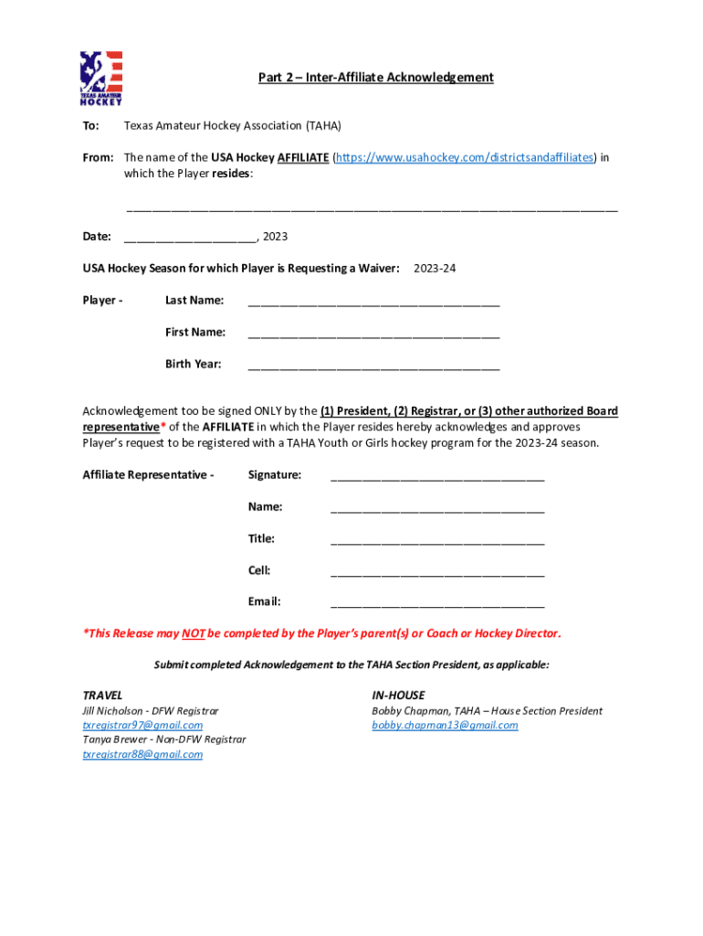 This document serves as an acknowledgment for players registering with TAHA Youth or Girls hockey programs for the 2023-24 season, requiring authorization from the Affiliate.