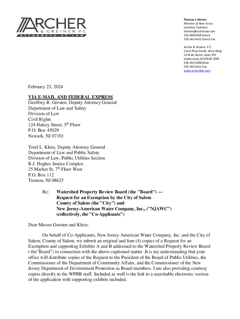 Thomas J. Herten Member of New Jersey and New York Bars therten@archerlaw.com 2014988502 Direct 2013426611 Direct Fax Archer & Greiner, P.C. Court Plaza South, West Wing 21 Main Street, Suite 353