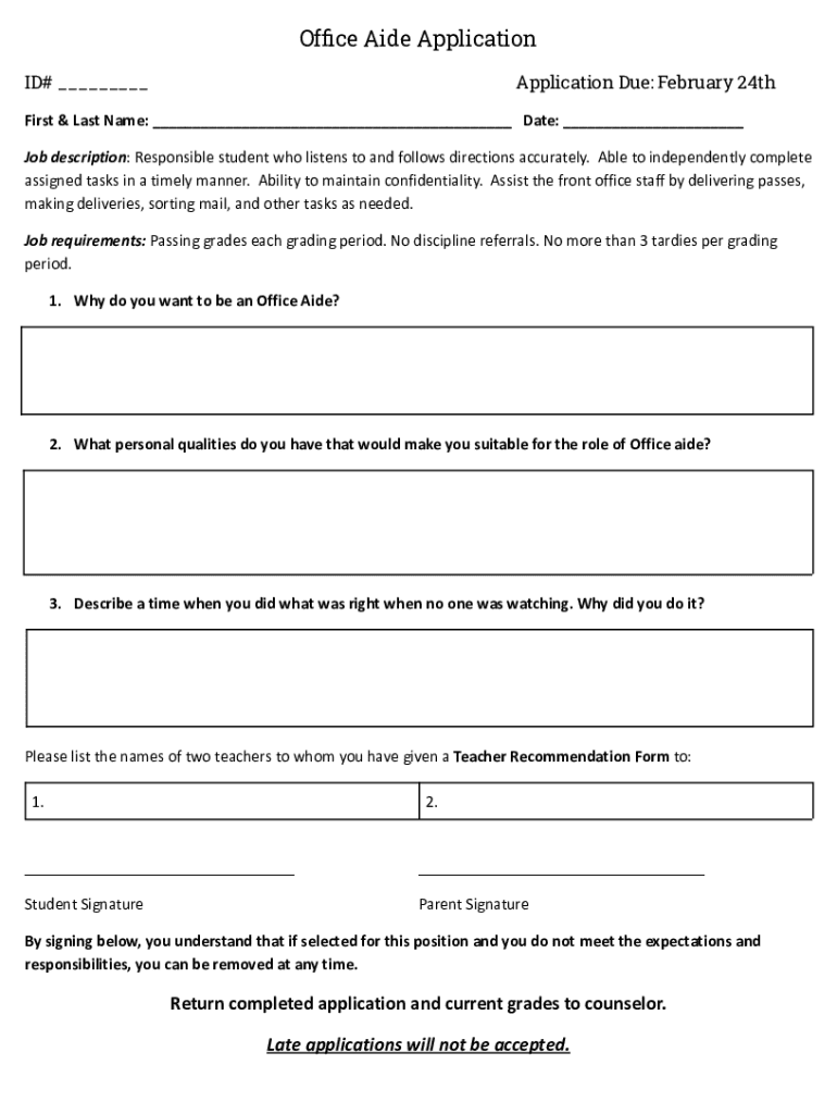 Office Aide Application ID# ___Application Due: February 24thFirst & Last Name: ___ Date: ___ Job description: Responsible student who listens to and follows directions accurately. Able to independently