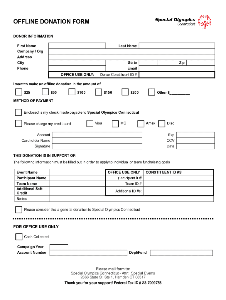Make a contribution to Special Olympics Connecticut with our offline donation form. Choose your donation amount and payment method to support our cause.