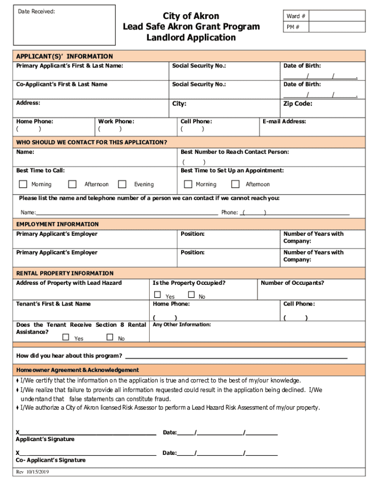 Homeowners, landlords, and property managers who are seeking financial assistance for lead hazard mitigation in residential properties located in Akron are typically required to file the Lead Safe Akron Grant.