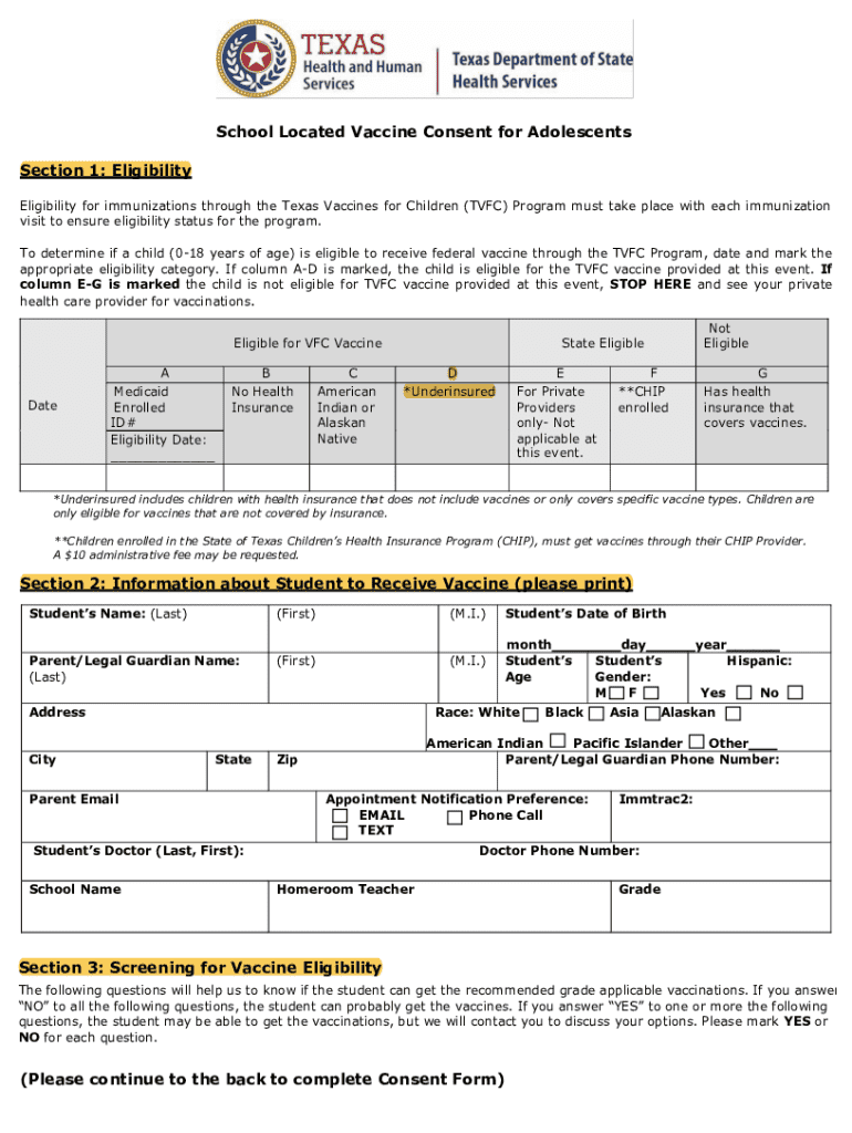 This form outlines eligibility for vaccines under the Texas Vaccines for Children Program and details the consent process for adolescent vaccinations.