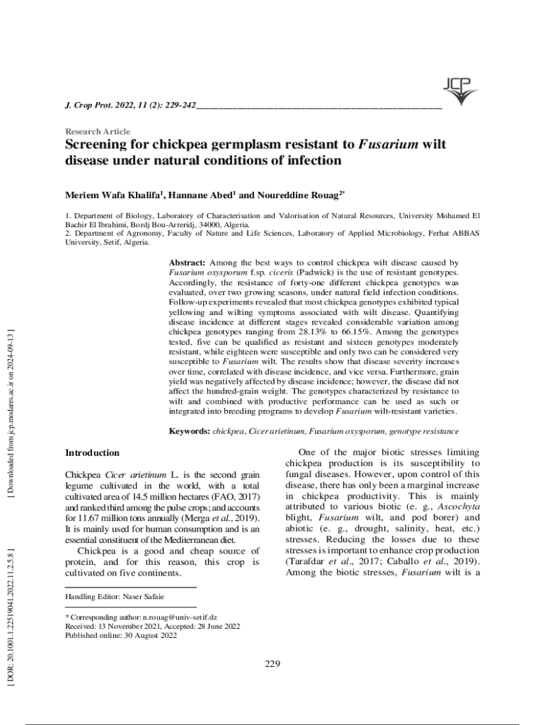 Get the free screening of chickpea genotypes for resistance to fusarium ... - jcp modares ac