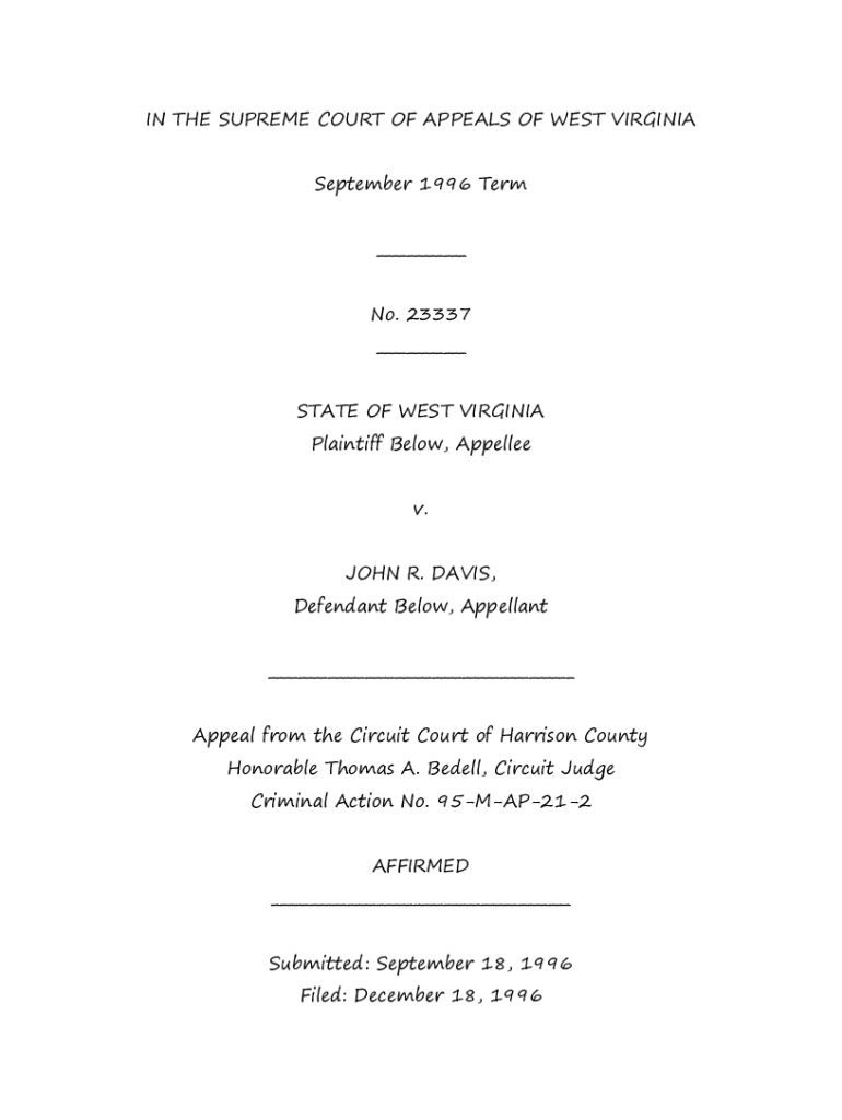 IN THE SUPREME COURT OF APPEALS OF WEST VIRGINIA September 1996 Term ___ No. 23337 ___ STATE OF WEST VIRGINIA Plaintiff Below, Appellee v. JOHN R. DAVIS, Defendant Below, Appellant ___ Appeal from
