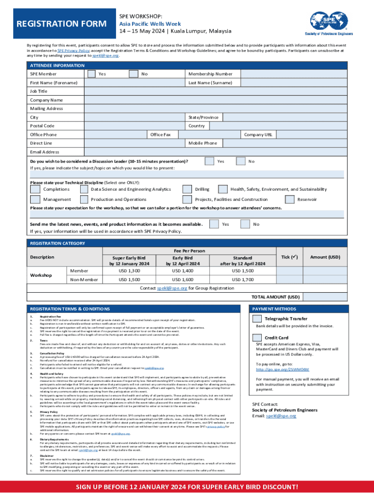The spe_workshop_registration_form is a document required for participants to register for workshops organized under the Society of Petroleum Engineers (SPE). It captures relevant details about the attendees.