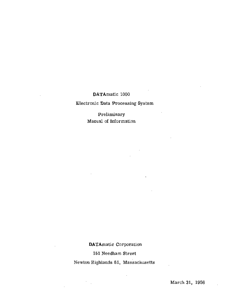 Dramatic 1000 Electronic Data Processing System Preliminary Manual of InformationDATAmatic Corporation 151 Needham Street Newton Highlands 61, Massachusetts March 31, 1956DATAmafic 1000 Performance
