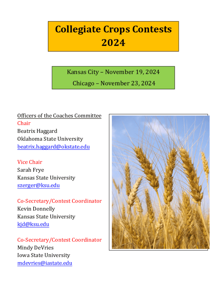 Collegiate Crops Contests 2024 Kansas City November 19, 2024, Chicago November 23, 2024Officers of the Coaches Committee Chair Beatrix Haggard Oklahoma State University beatrix.haggard@okstate.edu