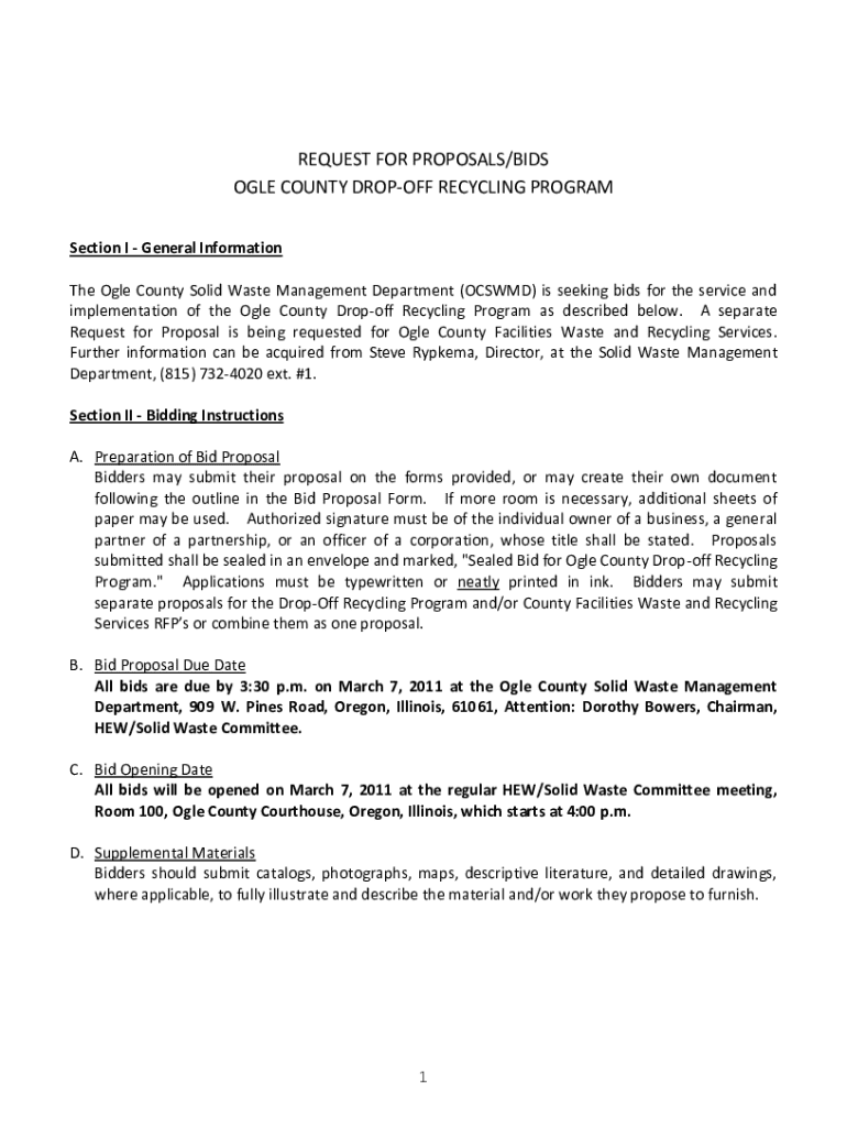 Seeking proposals for implementation of Ogle County\'s Drop-Off Recycling Program. Bids due by March 7, 2011. Comprehensive guidelines provided.