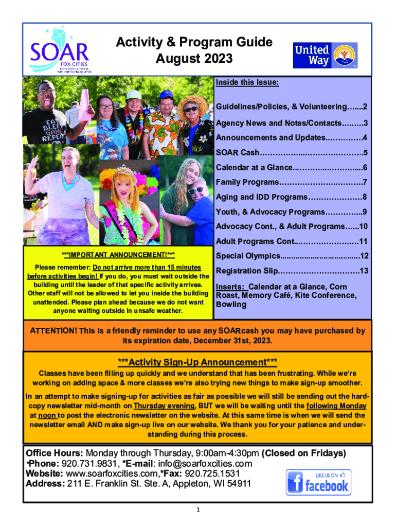 Activity & Program Guide August 2023 Inside this Issue: Guidelines/Policies, & Volunteering....2 Agency News and Notes/Contacts...3 Announcements and Updates...4 SOAR Cash.....5 Calendar at a Glance...........6