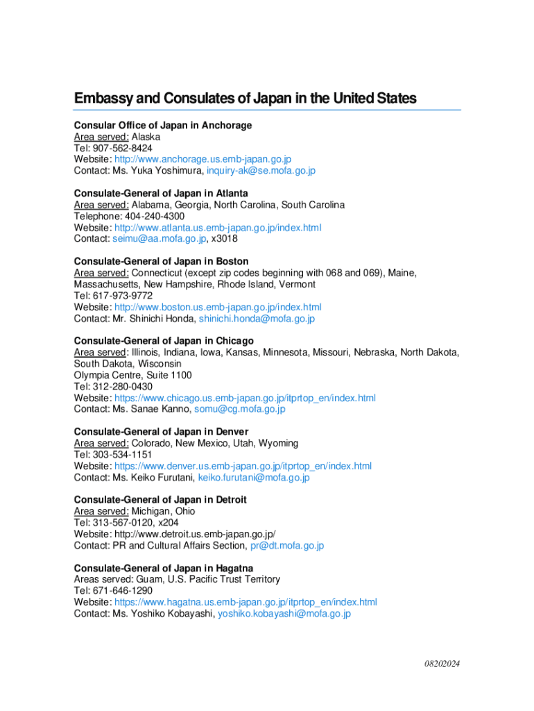 Embassy and Consulates of Japan in the United States Consular Office of Japan in Anchorage Area served: Alaska Tel: 9075628424 Website: http://www.anchorage.us.embjapan.go.jp Contact: Ms. Yuma Yoshimura,