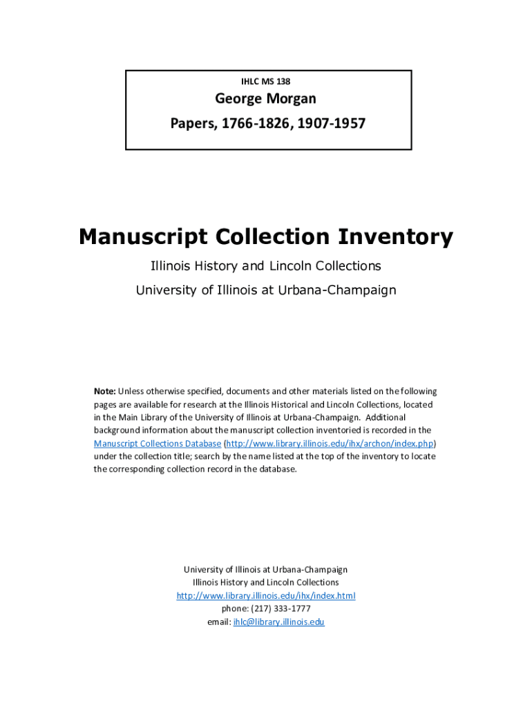 ILC MS 138George Morgan Papers, 17661826, 19071957Manuscript Collection Inventory Illinois History and Lincoln Collections University of Illinois at UrbanaChampaignNote: Unless otherwise specified,