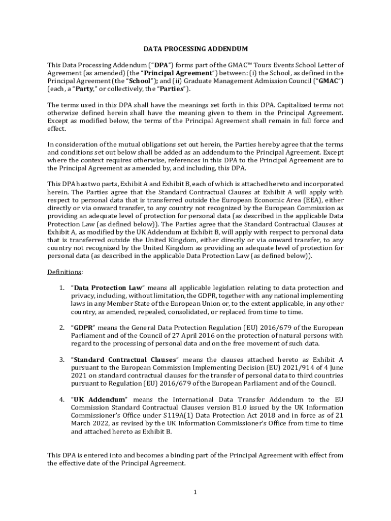 Comprehensive Data Processing Addendum detailing obligations and protections for personal data transfers under the GMAC Tours Events agreement, ensuring compliance with GDPR.