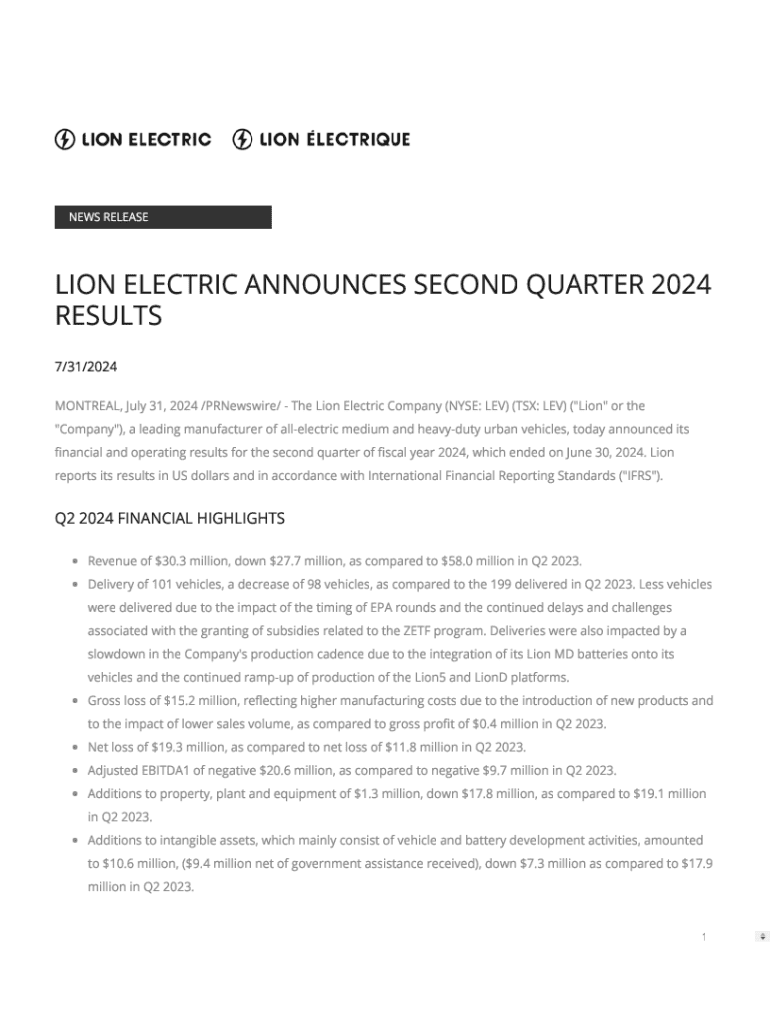 Discover Lion Electric\'s Q2 2024 financial highlights, including a revenue drop to $30.3M, gross loss of $15.2M, and strategic action plans to streamline operations.