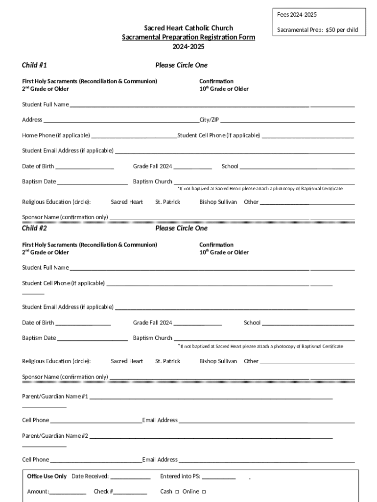 The Sacramental Preparation Registration is a writable document needed to be submitted to the relevant address to provide certain info. It has to be completed and signed, which is possible manually in hard copy, or with a particular solution such as PDFfiller. It lets you complete any PDF or Word document right in the web, customize it depending on your purposes and put a legally-binding electronic signature. Right after completion, you can send the Sacramental Preparation Registration to the appropriate recipient, or multiple recipients via email or fax. The blank is printable too from PDFfiller feature and options offered for printing out adjustment. In both digital and in hard copy, your form should have a neat and professional appearance. Also you can turn it into a template for further use, there's no need to create a new blank form again. All that needed is to edit the ready template.