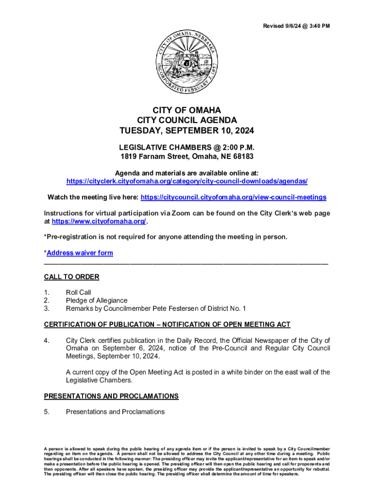 Revised 9/6/24 @ 3:40 CITY OF OMAHA CITY COUNCIL AGENDA TUESDAY, SEPTEMBER 10, 2024, LEGISLATIVE CHAMBERS @ 2:00 P.M. 1819 Farnham Street, Omaha, NE 68183 Agenda and materials are available online
