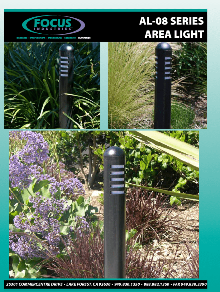 AL08 SERIES AREA LIGHT25301 COMMERCENTRE DRIVE LAKE FOREST, CA 92630 949.830.1350 888.882.1350 FAX 949.830.3390AREA LIGHTS AL08 SERIESTYPELEDREADYSPECIFICATIONS CONSTRUCTION: 3.5\” diameter aluminum,
