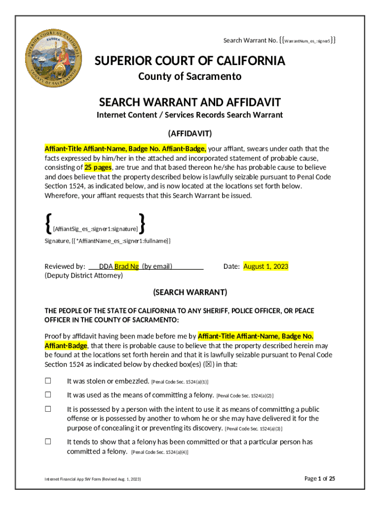 The Search Warrant No. [warrantnum] is a document that can be completed and signed for specified needs. Then, it is furnished to the actual addressee in order to provide some information and data. The completion and signing is able manually or via a suitable solution like PDFfiller. These applications help to fill out any PDF or Word file online. It also allows you to edit it for the needs you have and put legit e-signature. Once you're good, you send the Search Warrant No. [warrantnum] to the recipient or several recipients by mail and also fax. PDFfiller has got a feature and options that make your Word template printable. It offers various settings for printing out appearance. It does no matter how you'll deliver a document - in hard copy or by email - it will always look neat and clear. To not to create a new file from scratch again and again, turn the original document as a template. Later, you will have a rewritable sample.