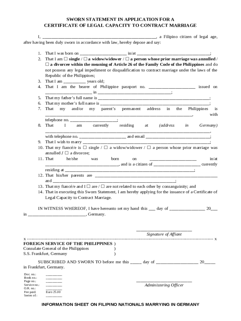 Sworn Statement for Certificate of Legal Capacity to Contract Marriage word template: frequently asked questions