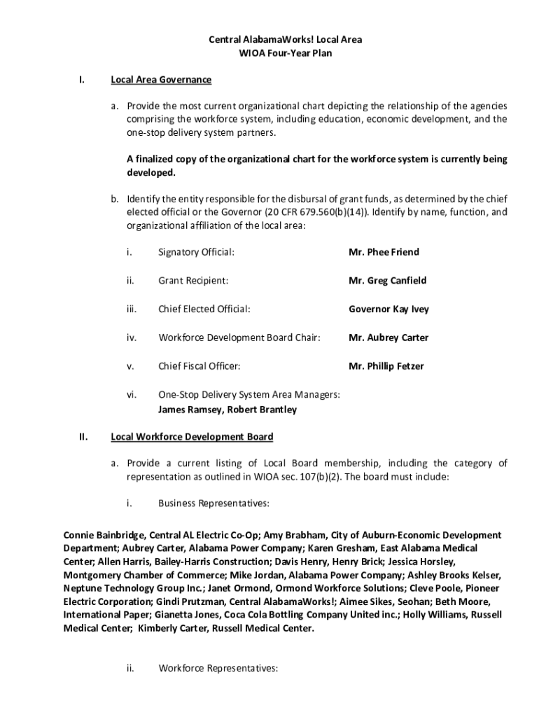 Central AlabamaWorks! Local Area WIOA FourYear Plan I.Local Area Governance a. Provide the most current organizational chart depicting the relationship of the agencies comprising the workforce system,