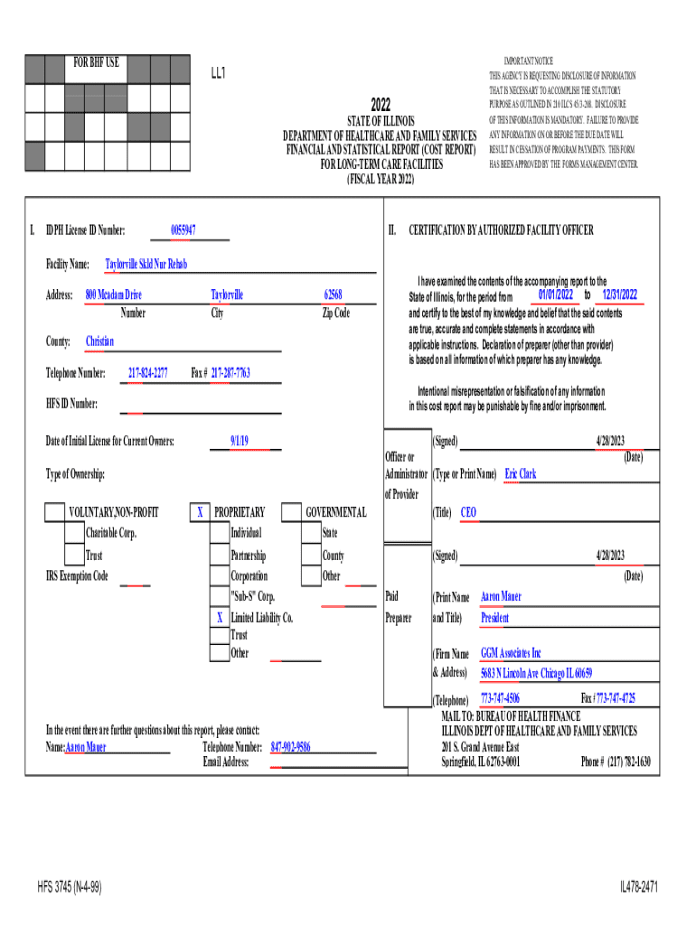 FOR BHF USELL1 2022STATE OF ILLINOIS DEPARTMENT OF HEALTHCARE AND FAMILY SERVICES FINANCIAL AND STATISTICAL REPORT (COST REPORT) FOR LONGTERM CARE FACILITIES (FISCAL YEAR 2022) I.IDPH License ID Number: