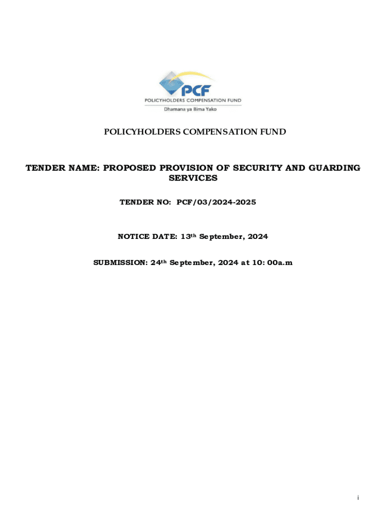 POLICYHOLDERS COMPENSATION BUDTENDER NAME: PROPOSED PROVISION OF SECURITY AND GUARDING SERVICES TENDER NO: PCF/03/20242025NOTICE DATE: 13th September 2024 SUBMISSION: 24th September 2024 at 10: 00a.mutable