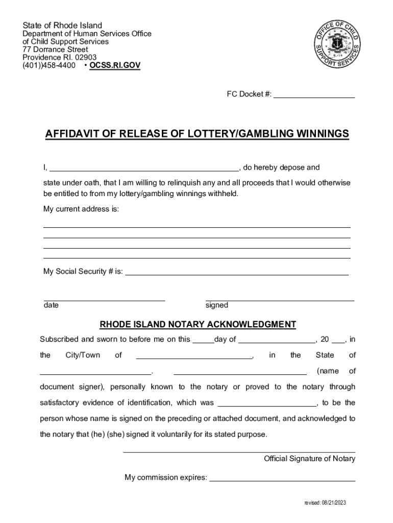 This affidavit allows individuals in Rhode Island to relinquish their lottery or gambling winnings. Required information includes personal details and notary acknowledgment.