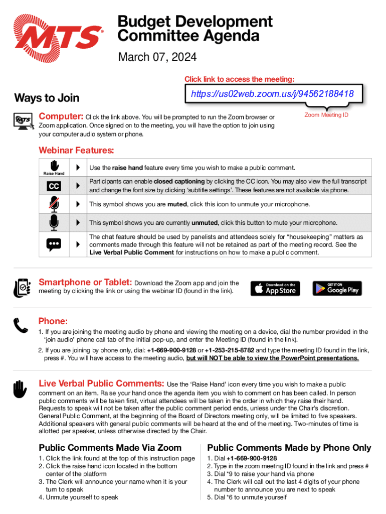 Budget Development Committee Agenda March 07, 2024 Click link to access the meeting:https://us02web.zoom.us/j/94562188418Ways to JoinComputer: Click the link above. You will be prompted to run the Zoom browser orZoom Meeting IDZoom application. Once signed on to the meeting, you will have the option to join using your computer audio system or phone.Webinar Features: Raise HandUse the raise hand feature every time you wish to make a public comment. articipants can enable closed captioning by...
