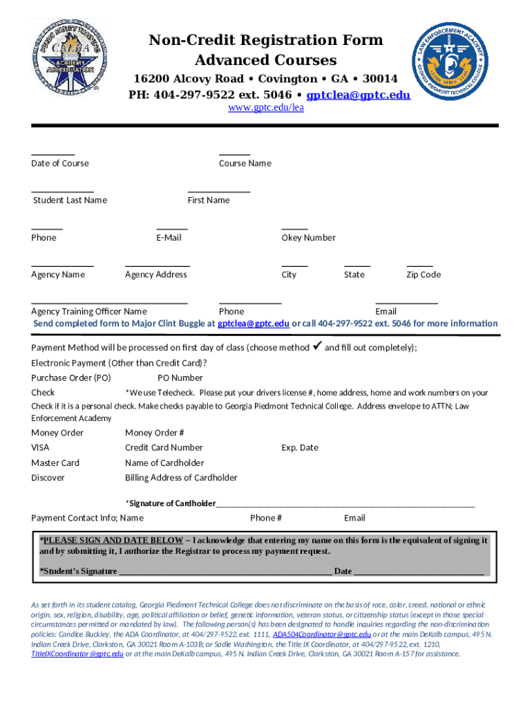 The Non-credit Registration is a document that should be submitted to the required address to provide certain info. It must be filled-out and signed, which can be done in hard copy, or using a particular software such as PDFfiller. This tool lets you fill out any PDF or Word document right in the web, customize it according to your purposes and put a legally-binding electronic signature. Once after completion, the user can easily send the Non-credit Registration to the appropriate receiver, or multiple recipients via email or fax. The blank is printable as well from PDFfiller feature and options proposed for printing out adjustment. In both digital and physical appearance, your form should have a organized and professional outlook. You can also turn it into a template to use it later, so you don't need to create a new document over and over. Just amend the ready form.