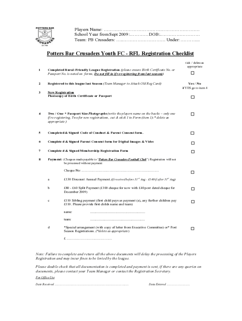 Get the free Potters Bar Crusaders Youth Fc Rfl Registration Checklist