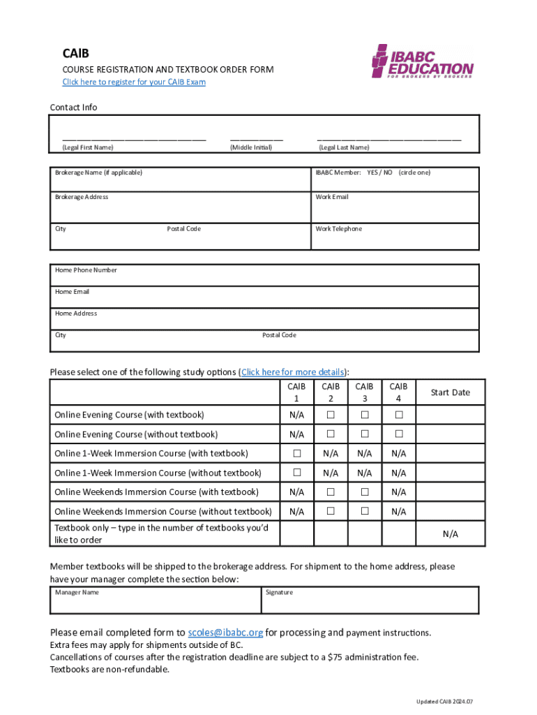 Register for the CAIB exam and order textbooks with this comprehensive form. Choose your study option and provide contact details for processing.