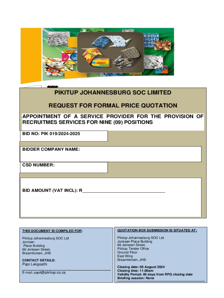PICKUP JOHANNESBURG SOC LIMITED REQUEST FOR FORMAL PRICE QUOTATION APPOINTMENT OF A SERVICE PROVIDER FOR THE PROVISION OF RECRUIT MES SERVICES FOR NINE (09) POSITIONS BID NO: PICK 019/20242025BIDDER