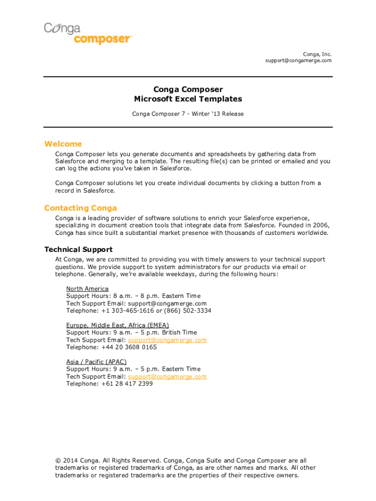 Conga, Inc. support@congamerge.comConga Composer Microsoft Excel Templates Conga Composer 7 Winter 13 ReleaseWelcome Conga Composer lets you generate documents and spreadsheets by gathering data from